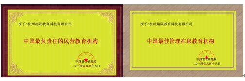 杭州超限教育中心分別獲得了浙江大學(xué)、廈門大學(xué)、西南大學(xué)、西北大學(xué)、澳大利亞墨爾本大學(xué)“最佳年度合作伙伴”稱號,獲得了由中國管理研究院頒發(fā)的“中國優(yōu)秀管理企業(yè)”稱號,由中國責(zé)任研究院頒發(fā)的“中國最負(fù)責(zé)任的企業(yè)”稱號。