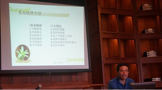 他首先從理論入手,結(jié)合理論講解進行了正格、非正格經(jīng)典聯(lián)例剖析,再以他的《飲和集》收集的楹聯(lián)為例,組織學員進行現(xiàn)場消化。學員們普遍感到深入淺出,通俗易懂。